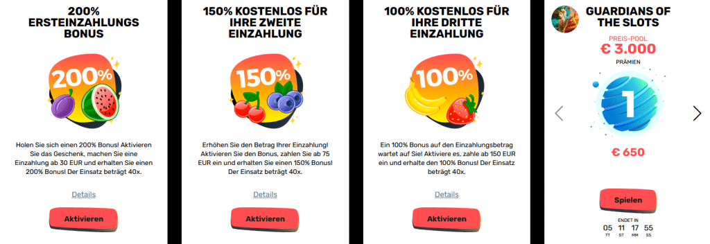 Die Benutzer werden vom SlottyWay Casino Bonussystem begeistert sein. In den besten Spielautomaten gibt es Bargeldboni und slottyway 60 free spins. Neulinge auf der Website können mehrere Einzahlungsprämien gleichzeitig für ihre ersten Einzahlungen auf der Website erhalten: